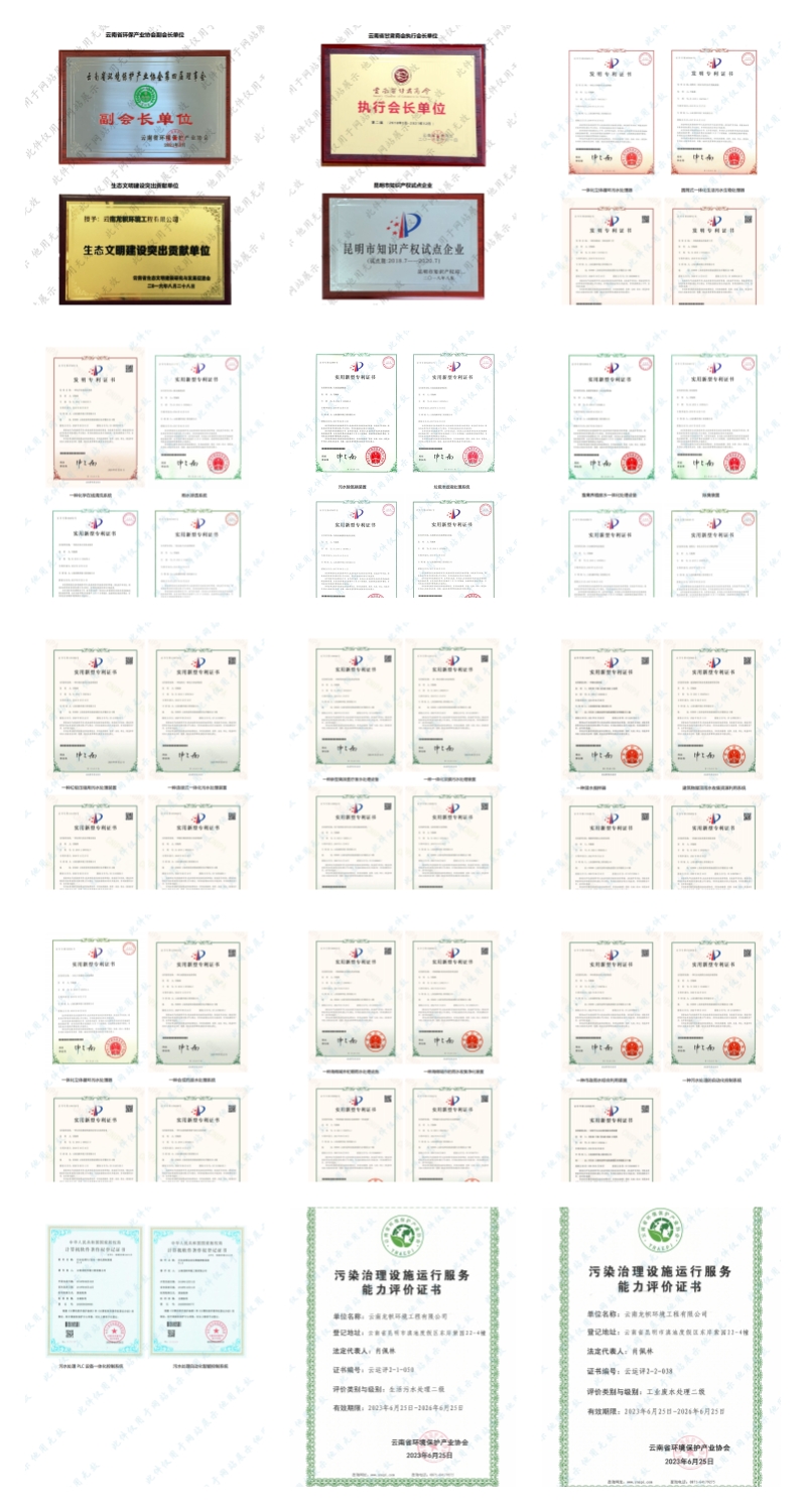 公司持有環(huán)保工程專(zhuān)業(yè)承包二級(jí)、市政公用工程總承包三級(jí)、建筑工程總承包三級(jí)、污染治理乙級(jí)、污染治理設(shè)施運(yùn)行服務(wù)二級(jí)資質(zhì)證書(shū)。前后獲得“十二五”生態(tài)文明建設(shè)突出貢獻(xiàn)單位、云南省省級(jí)成長(zhǎng)型中小企業(yè)、云南省知識(shí)產(chǎn)權(quán)優(yōu)勢(shì)企業(yè)、云南省科技型中小企業(yè)、云南省專(zhuān)精特新中小企業(yè)、招商蛇口最佳合作伙伴、中交置業(yè)友好合作方獎(jiǎng)等榮譽(yù)。